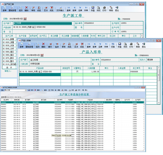 車間完成產品后,要填制產品入庫單,完成產成品和半成品的入庫手續,同時系統會將具體的入庫數據回填到派工單中,作為員工計件工資的計算依據。